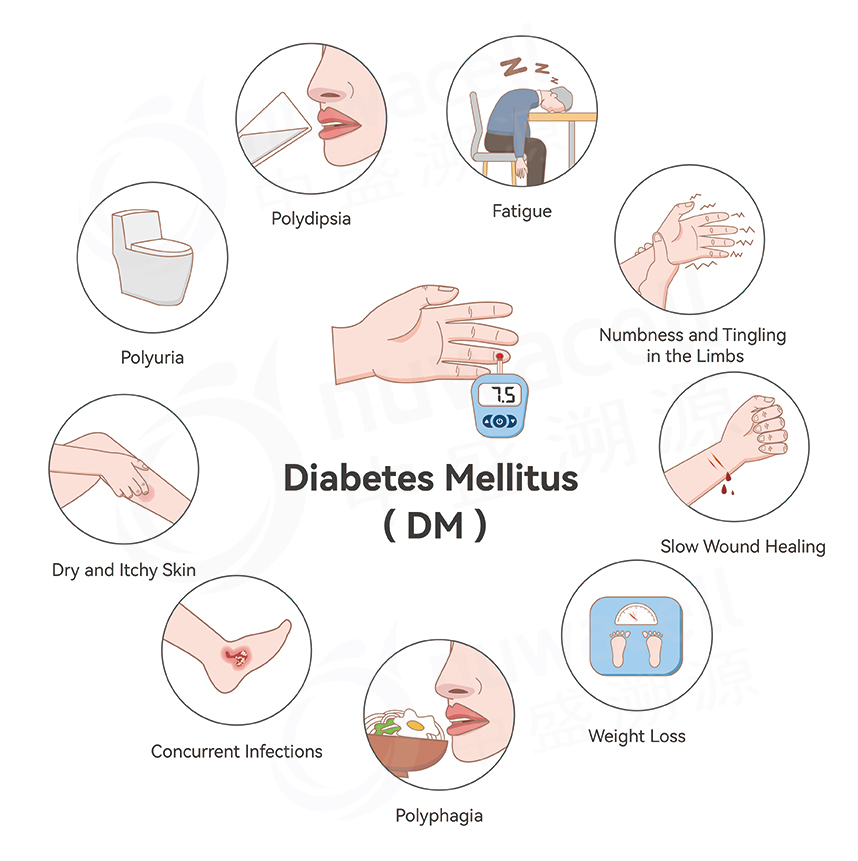 糖尿病(Diabetes Mellitus、DM)は、インスリン分泌の障害および様々な程度のインスリン抵抗性によって引き起こされる高血糖症です。初期症状は高血糖症に関連し、多飲、多尿、多食、視力のぼやけなどがあります。後期の合併症には、血管病変、末梢神経病変、腎疾患、感染症の発症リスク増加などがあります。